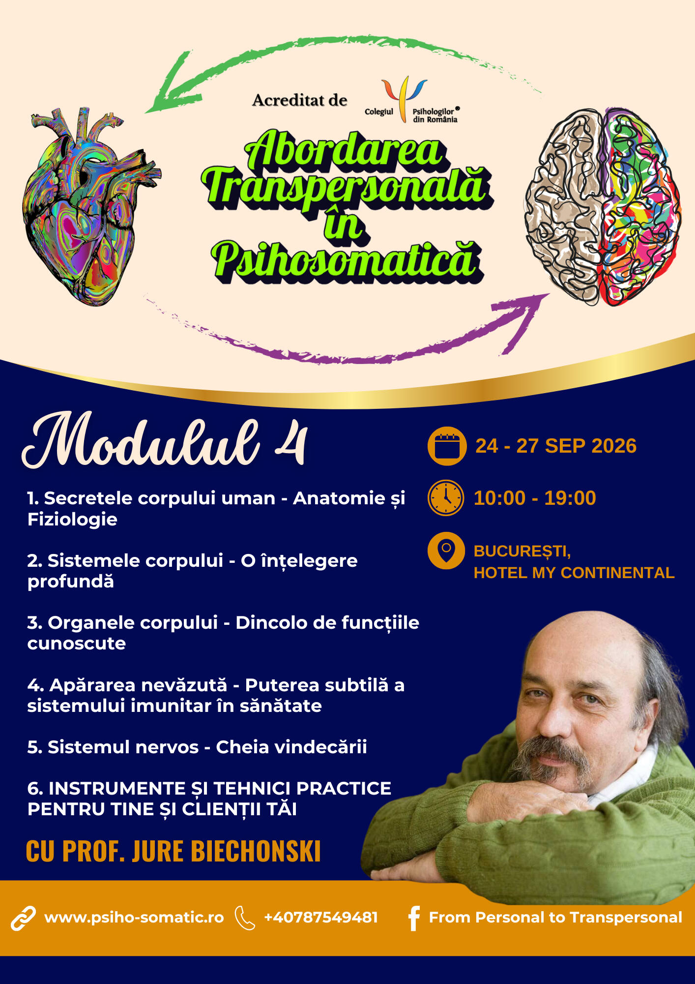 care va avea loc în București sau Online, în datele 19 - 22 feb 2026, 02 - 05 apr 2026, 18 - 21 iunie 2026, 24 - 27 sept 2026, zilnic între orele 10:00-19:00, Participantul acceptă termenii și condițiile prezentate în continuare.I. PĂRȚILE ACORDULUIORGANIZATOR: SĂNĂTATE INTEGRALĂ - CORP MINTE SUFLET S.R.L., CUI: 51101018.Sub denumirea de Brand „From Personal to Transpersonal”.PARTICIPANTUL - persoana care achiziționează biletul la eveniment.II. OBIECTUL ACORDULUIParticiparea live la evenimentul „Abordarea Transpersonală în Psihosomatică” ce va avea loc la București în datele: 24-27 Octombrie 2024